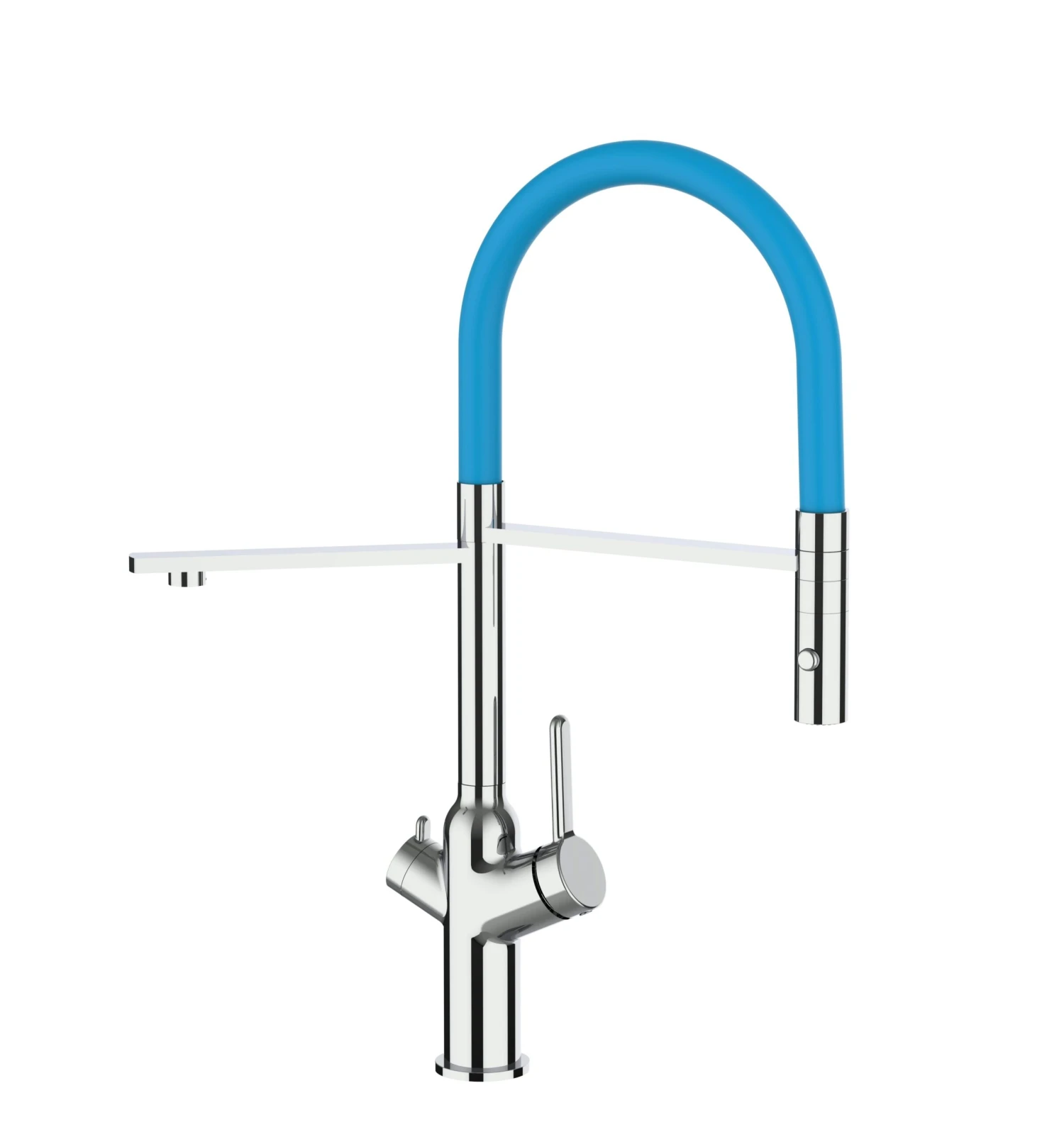 3 Wege Wasserhahn Küchenarmatur Spültischmischer BOD, Verchromt, Mit 360° Schwenkbarem Hellblau Auslauf Und Abnehmbare 2 Strahl Handbrause