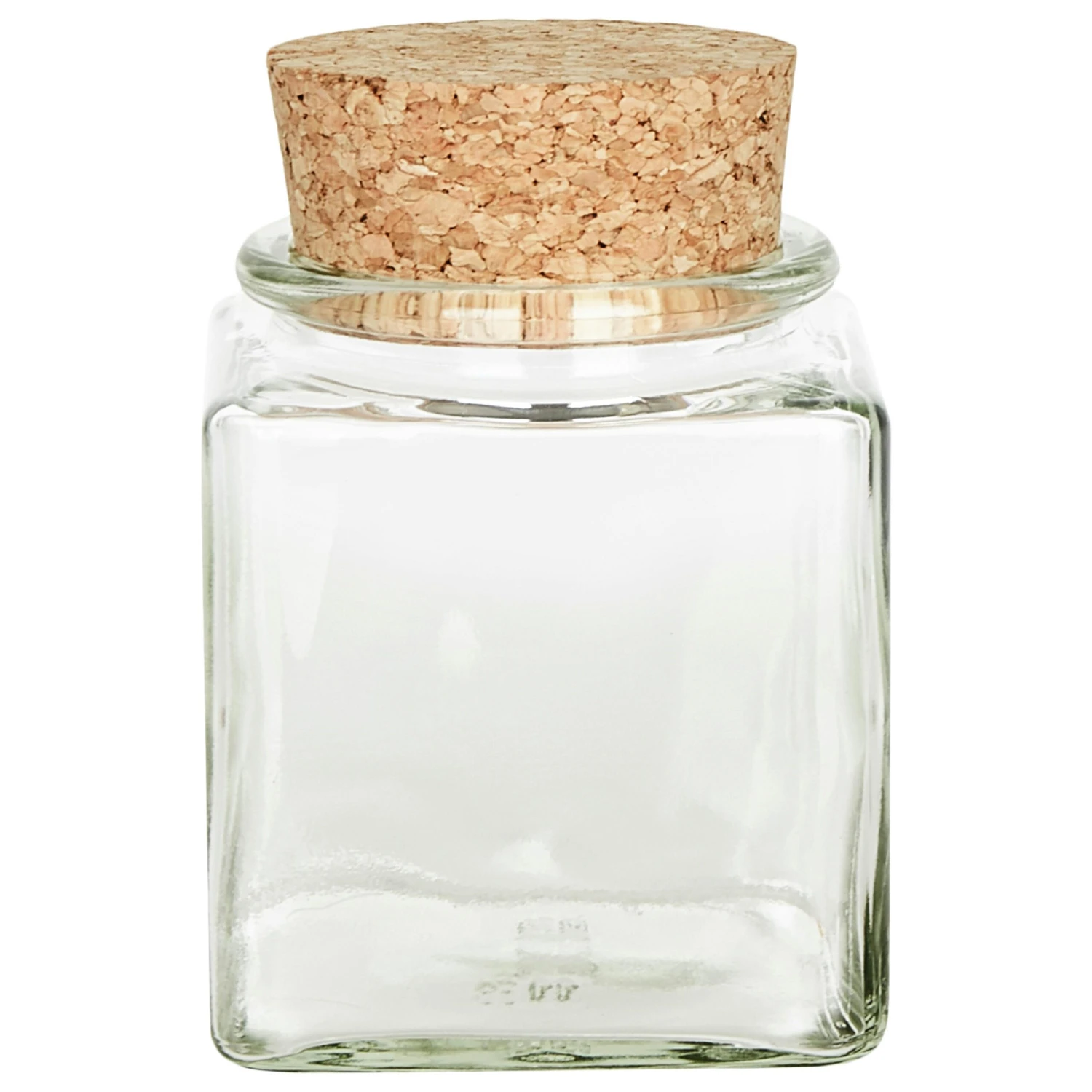 Der trendige Verschluss aus Naturkork ist Ø 5 cm weit, 2.5 cm hoch und misst Ø 4.3 cm an der schmalsten Stelle. Durch leichten Druck beim Aufsetzen können Inhalte optimal vor Feuchtigkeit und Umgebungspartikeln geschützt werden. Die quadratische Glasform bietet umlaufend vier Flächen zum Beschriften und Etikettieren, idealerweise im Format: (B x H) 4.5 x 5 cm.