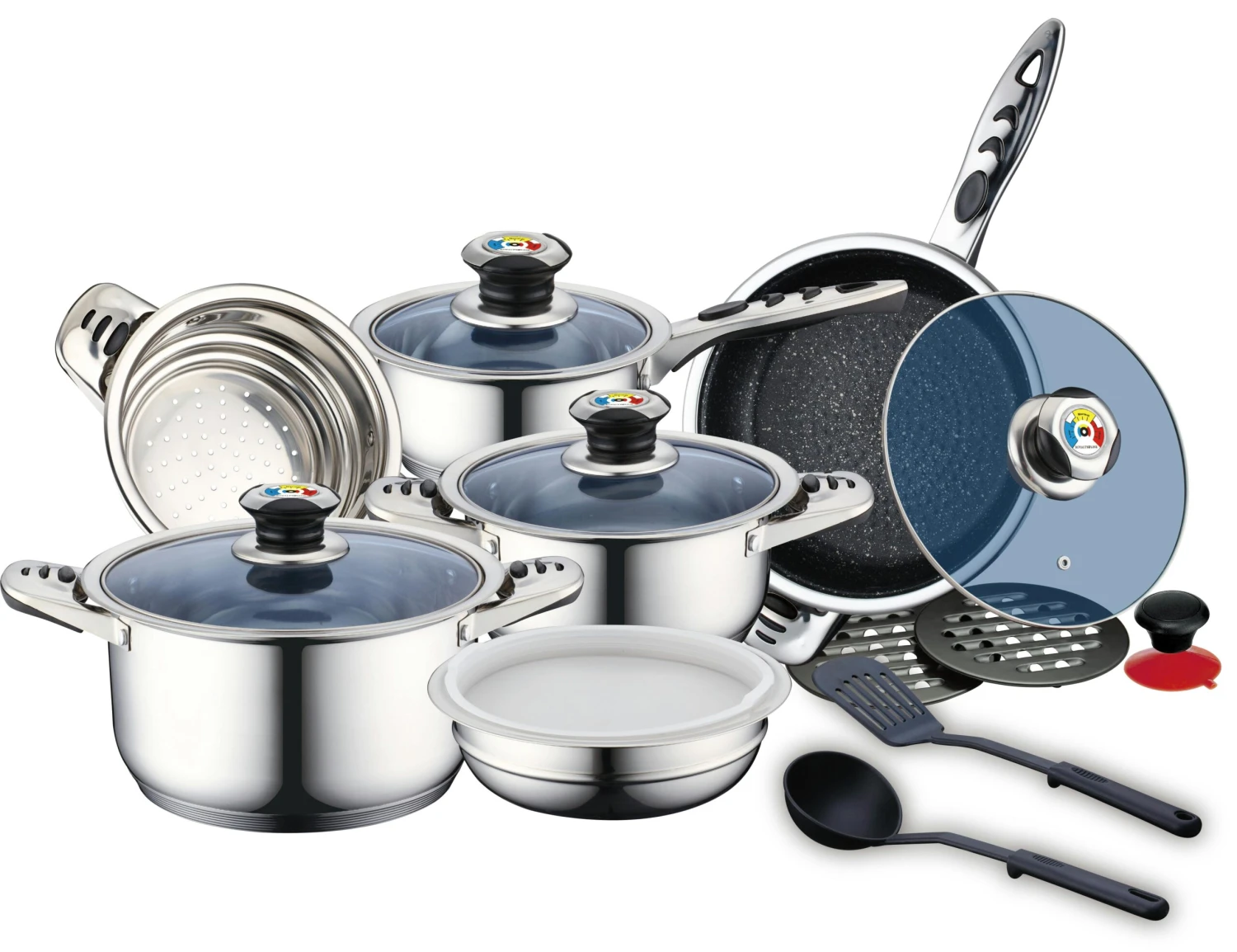 - Set aus 4 Bratpfannen und 2 flachen Töpfen mit Griffen und Glasdeckel