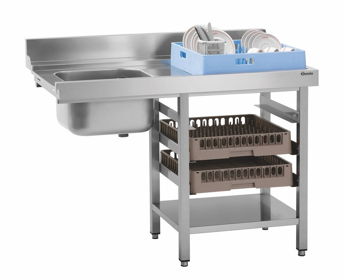 Die zu den Durchschubspülmaschinen DS passende Vorabräumung ist mit einem 40 Liter Spülbecken ausgestattet und ausgelegt für den rechtsseitgen Anbau. In den 3 praktischen Spülkorbeinschüben können 500x500er und 600x500er Körbe mit einer Höhe von bis zu 145 mm verstaut werden.