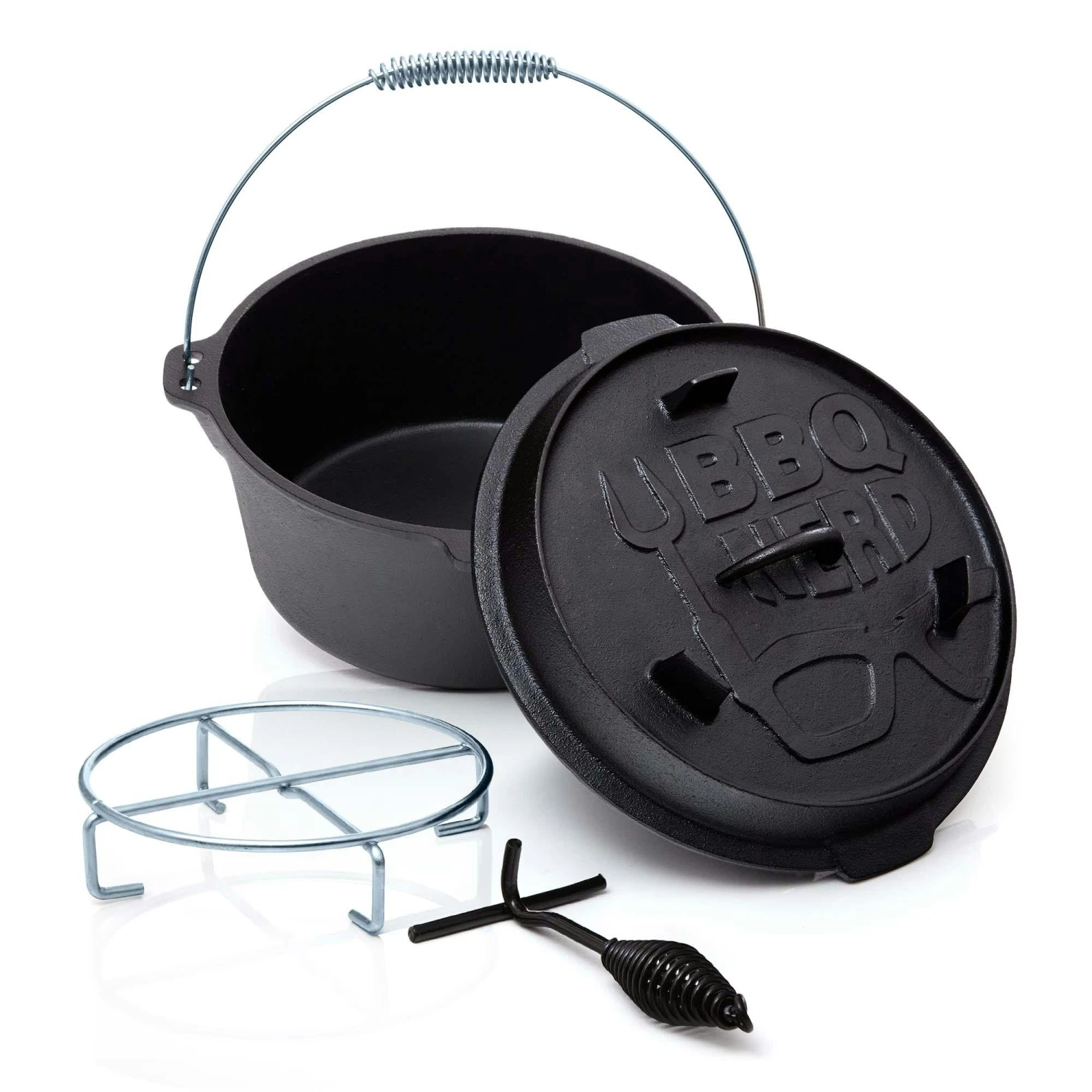 - DUTCH OVEN PREMIUM SET – Der feuerfeste Topf aus robustem Gusseisen ist ein Allrounder zum Kochen, Backen, Braten, Schmoren und Garen! Du kannst den Dutch Oven ins offene Feuer stellen, über dem Lagerfeuer aufhängen oder auf dem Grillrost benutzen.