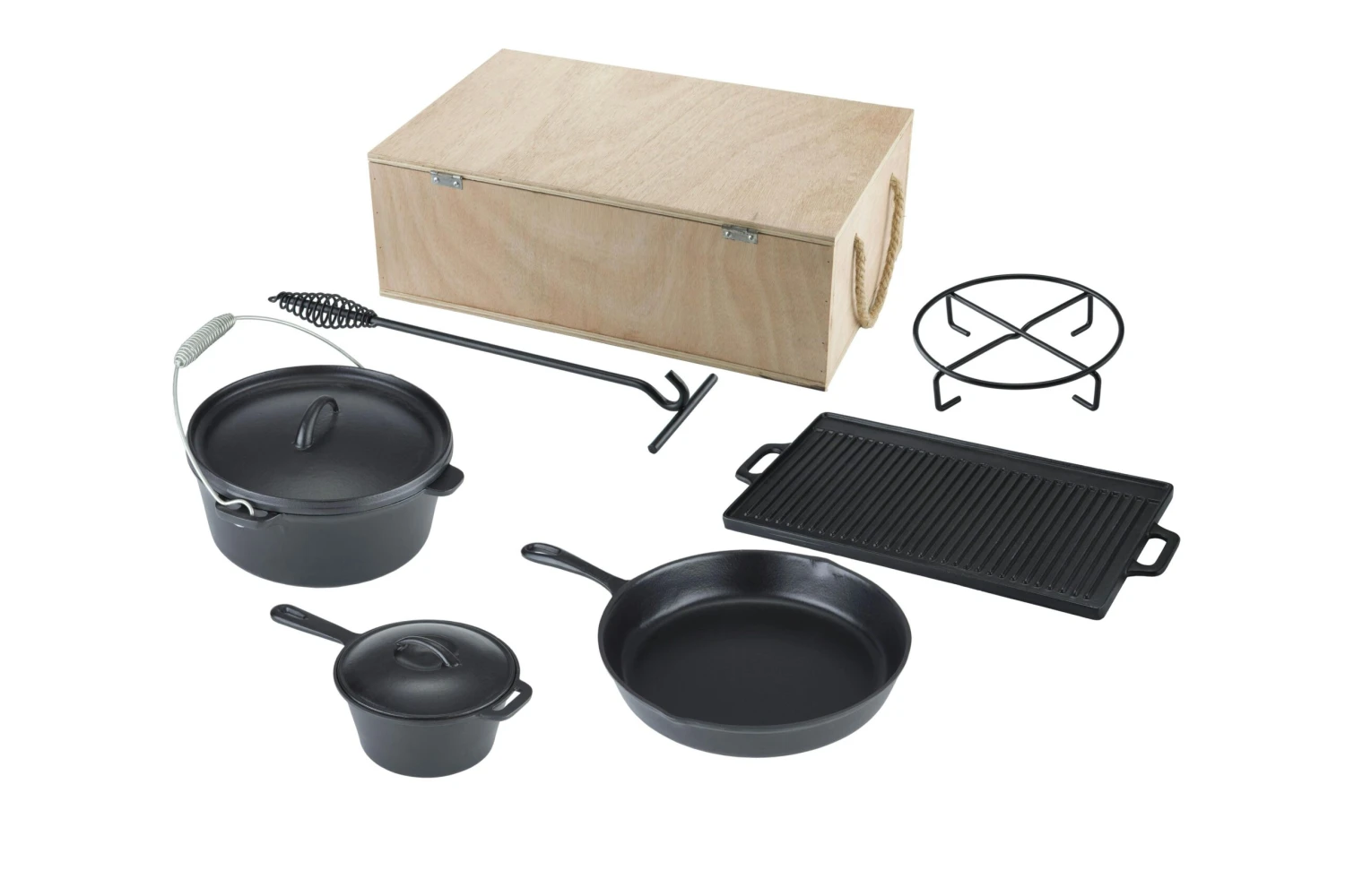 - DUTCH OVEN PREMIUM SET – Der feuerfeste Topf aus robustem Gusseisen ist ein Allrounder zum Kochen, Backen, Braten, Schmoren und Garen! Du kannst den Dutch Oven ins offene Feuer stellen, über dem Lagerfeuer aufhängen oder auf dem Grillrost benutzen.
