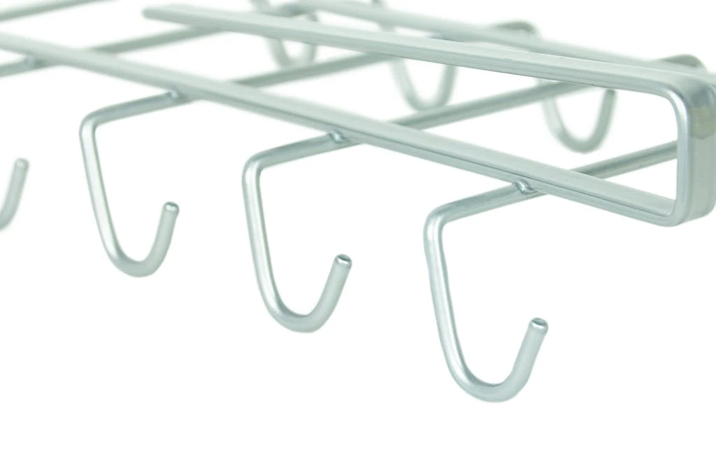 Der Halter bietet Platz für 10 Tassen und kann einfach unter einen Regalboden gehängt werden.