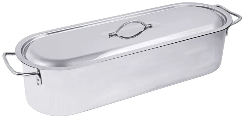 Fischkochkessel mit Außenmaß: 50,5×15,5xH11,5 cm, aus Edelstahl 18/0, seidenmatt poliert, mit gelochtem Siebeinsatz (10 mm-Lochung) und Deckel