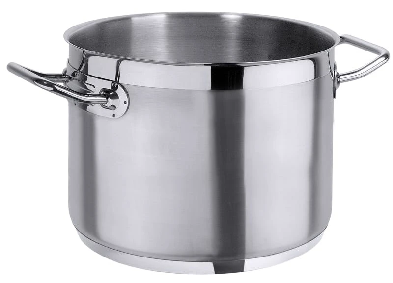 Kochtopf, hoch, aus Edelstahl 18/10, seidenmatt gebürstet mit (bis Ø 32 cm hochglänzendem) Schüttrand, verkapselter Sandwichboden bis Ø 32 cm, induktionsgeeignet, handliche Vollprofil-Kaltgriffe mit Schutzplatten, schwere Qualität