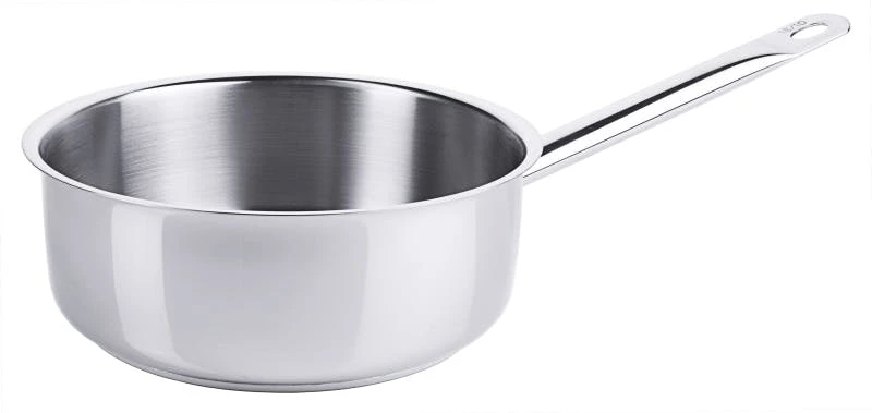 Stielkasserolle, mittelhoch, Sautoirform, aus Edelstahl 18/10, hochglänzend, mit Rohrgriff und Schüttrand, 8 mm Sandwichboden, induktionsgeeignet, schwere Qualität