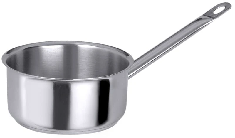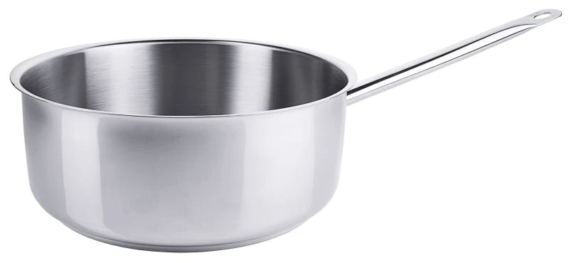 Stielkasserolle, mittelhoch, Sautoirform, aus Edelstahl 18/10, hochglänzend, mit Rohrgriff und Schüttrand, 8 mm Sandwichboden, induktionsgeeignet, schwere Qualität