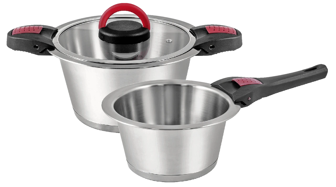Quick Clack Pro ist flexibel einsetzbar, vielseitig und platzsparend für die Profiküche: Das neue Koch- und Bratsystem Quick Clack Pro ist vielseitig einsetzbar und platzsparend durch die abnehmbaren Griffe, da sie ineinander stapelbar sind. Die Artikel sind optimal zum Braten, Kochen, Überbacken, Nachgaren im Ofen, Vorbereitung von Soßen und Suppen und als Schmelzschale (Wasserbad) für die Profi- und Gastroküche geeignet. Hergestellt aus hochwertigen 18/10-Edelstahl. Die Pfannen gibt es auch mit einer mehrfach gebrannten Antihaftbeschichtung. Quick Clack Pro ist für alle Herdarten geeignet.