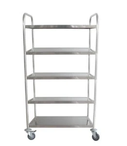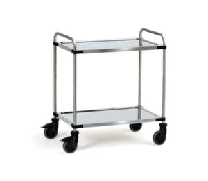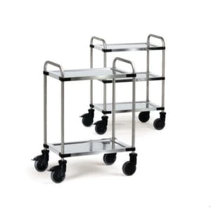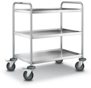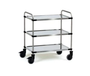 Edelstahl-Etagenwagen, Traglast 120 kg, mit 3 Etage(n), Ladefläche Länge x Breite 800 x 500 mm, Böden aus Edelstahl mit Rand, schallgedämmt, Höhe x Länge x Breite 950 x 900 x 600 mm, 4 Lenkrollen, 4 Abweisrollen, Rad Ø 125 mm, mit Vollgummi-Bereifung, 2 Lenkrollen mit Feststellern, Radanordnung rechteckig.