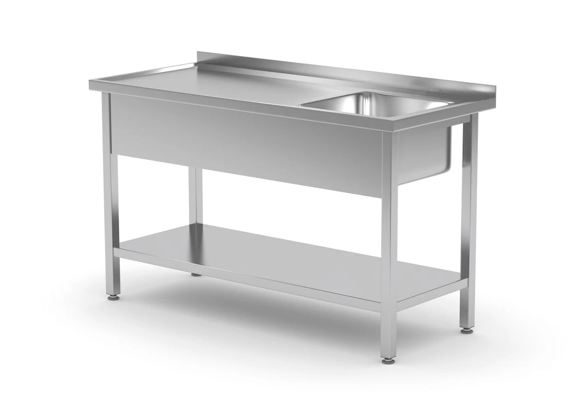 Der Gastro-Spültisch mit Ablagefach & 2 Schubladen wird aus rostbeständigem Stahl AISI 430 hergestellt und erfüllt alle erforderlichen funktionellen Anforderungen der professionellen Gastronomie. Der Spültisch hat eine äußerst hohe Beständigkeit gegen Säuren und chemische Mittel. Er ist mit einer Aufkantung in Höhe von 4cm sowie einer Frontabdeckung ausgestattet, die für zusätzlichen Schutz sorgen. Verstellbare Füße machen den Tisch zudem sehr flexibel. Erhältlich ist der Spültisch in mehreren Größen, die sich jeweils in der Tiefe und Breite unterscheiden.