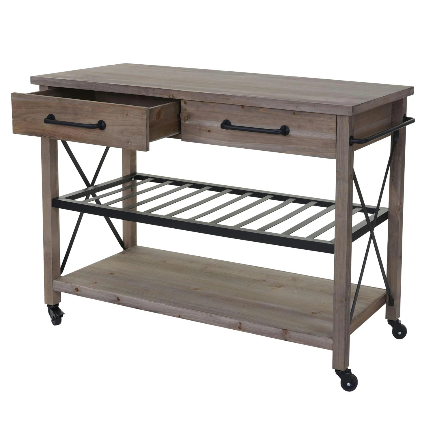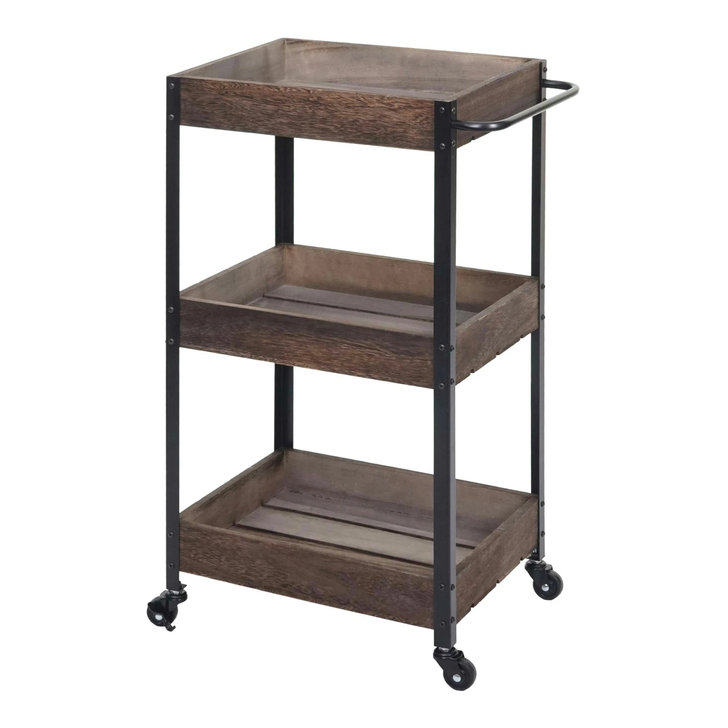 Dürfen wir vorstellen: Ihr neuer Allzweck-Küchenhelfer. Egal ob Sie ihn als zusätzlichen Lagerplatz für Ihre Lebensmittel, als Beistelltisch oder als Servierwagen verwenden wollen – alles kein Problem. Dank seiner Rollen kann er jederzeit bequem bewegt und an den hinteren Rollen auch arretiert und somit sicher abgestellt werden. Die Arbeitsfläche bietet sogar ausreichend Platz um ein Essen zuzubereiten. Der Wagen ist durch das Kiefernholz sowohl robust als auch stabil. Die mittlere Ablage kann sowohl als Flaschenablage genutzt werden oder aber auch für Kochbücher oder sonstige Küchenutensilien. Der individuelle Look wirkt einerseits rustikal, anderseits schafft es Akzente.