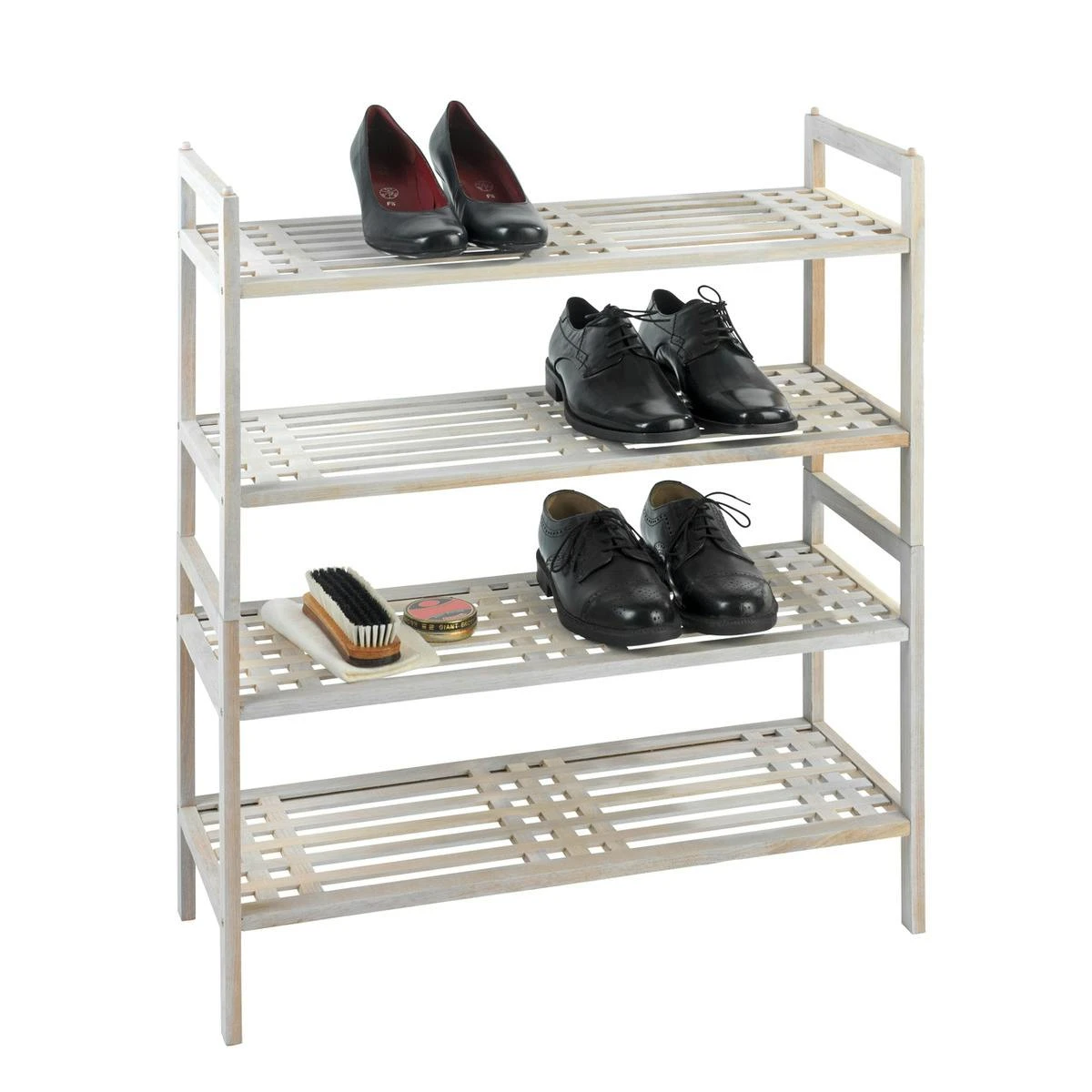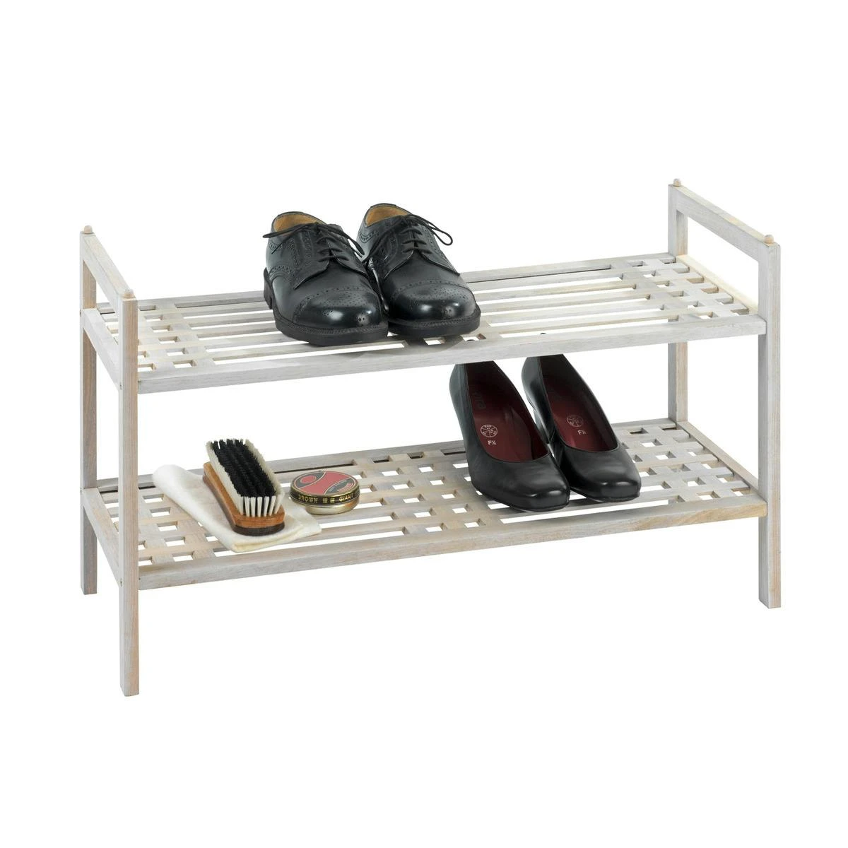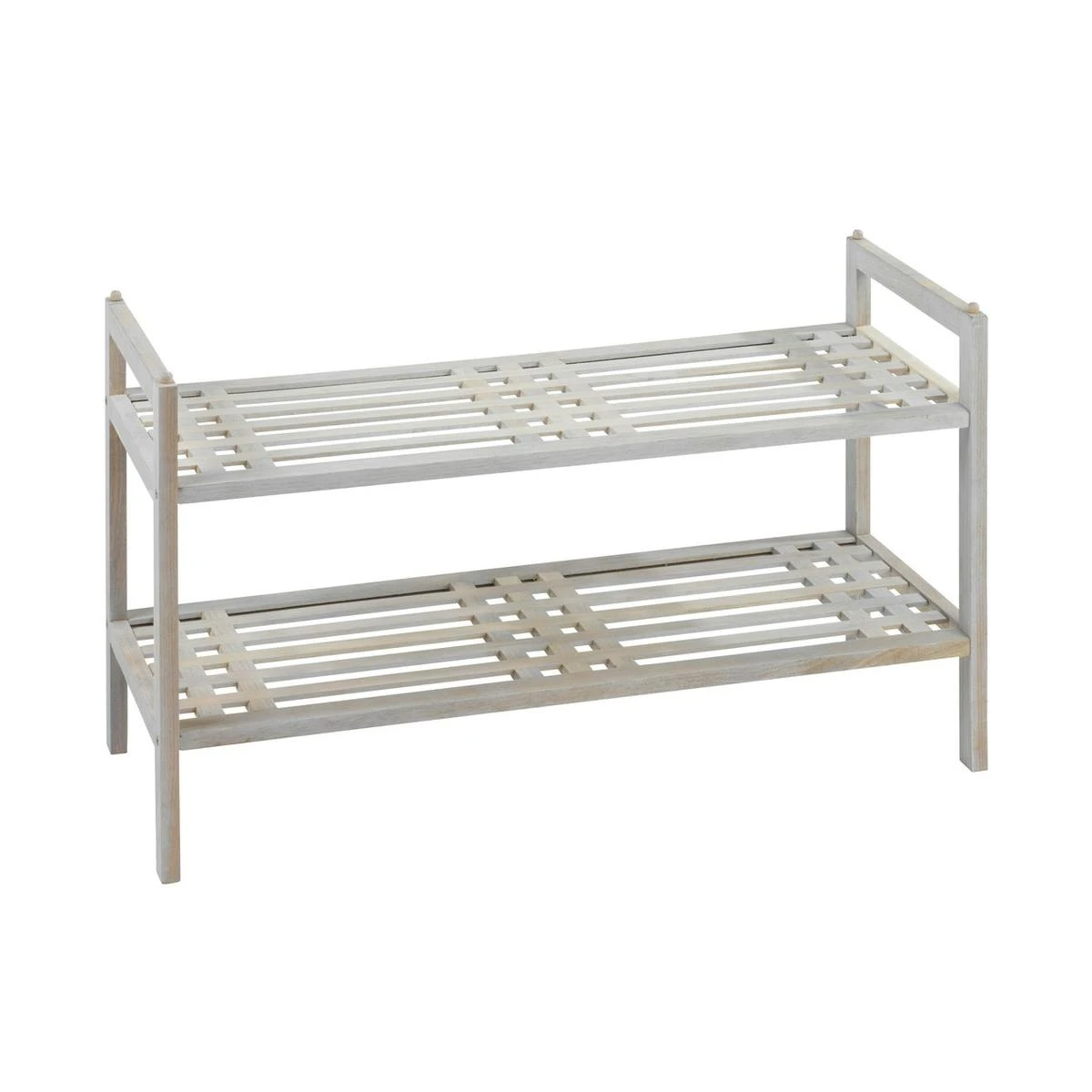 Die bezaubernde Ausstrahlung des weiß gekälkten Naturholzes der Möbelserie Norway, die schlichte Form und die praktischen Einsatzmöglichkeiten machen dieses geräumigen Schuhregals zu einer idealen Kombination aus Design und Funktionalität für das Wohnambiente. Mit seinen klaren Linien präsentiert sich das Regal Norway außergewöhnlich und schön in Ihrer Wohneinrichtung und verleiht jeden Raum eine schlichte Eleganz. Wo das Schuhregal zum Einsatz kommt, bleibt ganz allein Ihnen überlassen, denn egal ob in der Diele oder im Wohnbereich, die zwei Regalböden bieten ausreichend Platz für bis zu 6 Paar Schuhe. Besonders praktisch: Das Schuhregal ist stapelbar und lässt sich somit nach Belieben jederzeit erweitern. Durch die individuelle Verarbeitung und spezielle Farbbehandlung mit Mahlgut entsteht eine transparent-weiße Farbschicht, welche perfekt auf den Landhausstil abgestimmt ist und dem gesamten Haushalt eine romantische Atmosphäre im Shabby-Chic Stil verleiht.